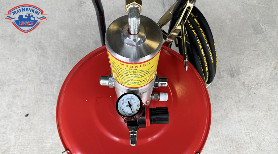 - Máy bơm mỡ khí nén 40 lít loại nhỏ được trang bị cụm chỉnh áp giúp người dùng theo dõi áp lực khí nén, điều chỉnh áp lực mỡ đầu ra phù hợp với các vị trí cần bảo dưỡng khác nhau.
